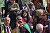 Så stoppet han opp noen sekunder da han ble overdøvet av Palestina-demonstranter med megafon.