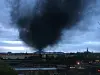 Røyken fra brannen ved Jordal Amfi var synlig fra store deler av byen. Her et bilde tatt over Kværnerdalen. Til høyre skimtes spiret på Vålrenga kirke, og til venstre er spiret på Kampen kirke. Foto: Cornelius Poppe / NTB scanpix