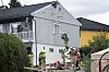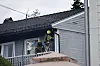 Brannvesenet i iherdig arbeid på stedet der brannen hadde spredd seg til et loft i en enebolig. Omkringliggende boliger ble evakuert.Foto: Geir Olsen / NTB