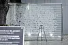 Minnesmerket med navn på drepte ofre etter terrorangrepet 22. juli 2011 på minnestedet foran Høyblokka i Regjeringskvartalet. Samtlige navn skal leses opp her under minnemarkeringen tirsdag.Foto: Amanda Pedersen Giske / NTB
