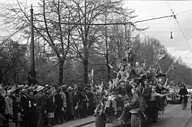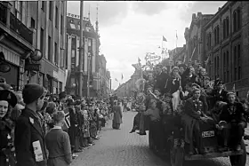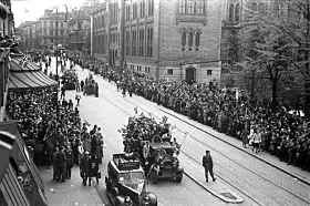 Biler fulle av jublende mennesker med norske flagg, folkemengder i Karl Johans gate for 80 år siden.Foto: Aage Kihle / NTB