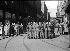 Tyske soldater var fremdeles i Oslo 8. mai. Her en gruppe i fulle uniformer og med gevær, som mottar instruksjoner i Rosenkrantz' gate.Foto: Aage Kihle / NTB