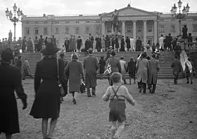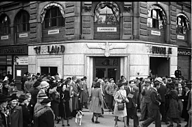 Folkemengde på hjørnet av Studenterlunden. Noen har til og med klatret opp på taket av den gamle avis-kiosken.Foto: Aage Kihle / NTB