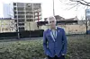 Dekan for de kreative fagene ved Høyskolen Kristiania, Jørn Mortensen, gleder seg til å flytte inn i bygget som reiser seg i bakgrunnen. Innflyttingen skjer til skolestart høsten 2021. Foto: Christian Boger