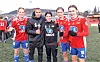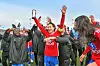Skeids kaptein Fredrik Berglie med pokalen som beviser at de har vunnet 2. div. avd 2. Simen Hestnes gir kapteinen en god klem, mens David Hickson, Matarr Kah og Hayder Altai tar en sa-sa-sa.Foto: Anders Vindegg