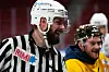 Dommerduoen Villiam Strøm (t.v.) og Joachim Svendsen benyttet humor for å holde temperaturen nede i kampen.Foto: André Kjernsli