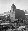 Pipervika kirke fotografert noen dager før den skulle rives i februar 1959. Hele området rundt er allerede lagt i grus. I bakgrunnen skimtes Victoria Terrasse. Foto: NTB / Scanpix