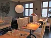 Når jeg kommer inn kjenner jeg en solid matlukt. Henrik skjærer av smeltet ost varmet over en raclette-grill. Da han og samarbeidspartnerne kom inn i de nyoppussede lokalene på Mangelsgaarden så de raskt at de måtte skape en plass som stod i stil til stedet.