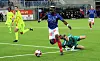 Saprsborgs ellers så gode keeper, Aleksandr Vasyutin, ser ballen gå forbi . Sam Johnson har akkurat satt ballen i tverrliggeren og innbytter Grødem følger spent med. Men ballen vil bare ikke inn for Vålerenga denne novemberkvelden. Foto: André Kjernsli