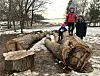 Magnus (3) (f.v) og broren hans, Johan (5), har funnet en ny lekeplass, etter at folk fra bymiljøetaten har felt ett av de mange store trærne i alleen langs turveien ut mot Hukodden. Her er småguttene på søndagstur med pappa Aslak Widerøe Kristoffersen.Foto: Paul Torvik Nilsen
