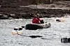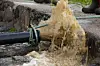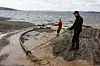 Tarjei Pettersen drar ut en lang slange fra båten og pumper ut fin sand på den steinete nudiststranda på Huk. Til glede for naturistene.
