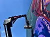 Det har blitt jobbet fra lift i høyden for å få fylt den store veggen med kunst.Foto: Ingri Valen Egeland