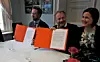 Modernisering- og kommunalminister Nikolay Astrup, byrådsleder Raymond Johansen og byråd Hanna Marcussen med avtalen ferdig signert. Foto: Anders Høilund