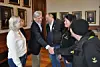 James Stove Lorentzen (H) hilser på Lars Johan Mortensen. Til venstre Aina Stenersen (Frp), Frode Woldsund (i midten) og Jorunn Mahisen (delvis skjult). Foto: Arnsten Linstad