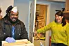 Omar med kassene han lager av sengebunner folk har kastet. � Redesignet gjenbruk, sier Omar og ler så hyller, vegger og tak igjen rister på det lille verkstedet. Til høyre er daglig leder Jorunn Mathisen smitttet av rastamannens ustoppelig gode arbeidshumør. Foto: Arnsten Linstad