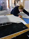 Ann-Sofie Indgul arbeider med snitt. På benken ligger en illustrasjon av hvor Kampen kulturbryggeri ligger i terrenget, og hvordan lyssjakter er tenkt plassert. Foto: Telhaug og Indgul