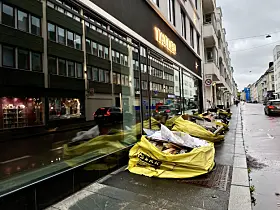 Fulle, gule avfallssekker sto igjen på fortauet utenfor i Industrigata mandag morgen.Foto: Ingri Valen Egeland
