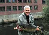 Her har rektor Jørn Mortensen på Kunsthøyskolen akkurat fanget en Akerselva-laks på 6,66 kilo, og det kun en kort tur fra arbeidsplassen litt lenger opp langs elva. Foto: Eirik Ballo