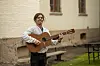 Kristian Larsson bidrar med musikk gjennom hele forestillingen. Ulike scener blir akkompagnert med ulike instrumenter, inkludert gitar, trekkspill og keyboard.Foto: Olav Helland