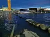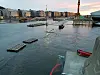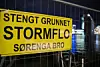 Broen fra Sørenga over mot Sukkerbiten ble stengt på grunn av den høye vannstanden. Vannet etter at bildet er tatt og hadde en forventet topp ved 19-tiden mandag. Foto: Christian Boger