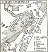 Dette kartet fra Oslo byleksikons utgave fra 1938 viser tydelig Bjølsen Valsemølles hus vest for elva, og Martinsens hage blir på dette kartet kalt Park. Huset som ligger inntil Treschows gate er Glasshuset.Faksimile fra Oslo byleksikon utgave 1938