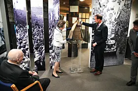 De to kongelige fikk en omvisning på museet og traff tidsvitnet Trond Johansen (100), som jobbet som agent for etterretningsorganisasjonen med kodenavn XU i Drammen.