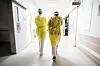To sykepleiere kledd i smittevernutstyr går for å ta i mot en pasient med covid-symptomer på akuttmottaket på Ahus på Lørenskog i Viken.Foto: Håkon Mosvold Larsen / NTB