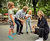 Rektor Ronny Sollien Engebråten og byråd for oppvekst og kunnskap Inga Marte Thorkildsen snakker med representanter for de aller viktigste på Bolteløkka skole. Bernhard på sju og Sofia på seks år. Foto: Morten Lauveng Jørgensen
