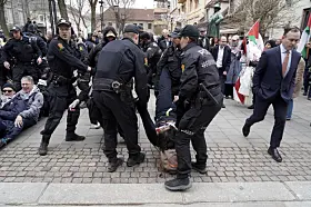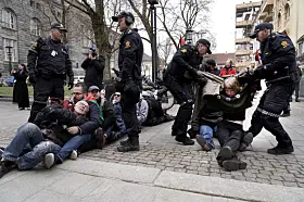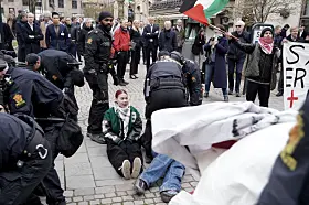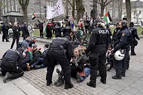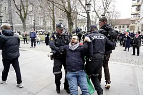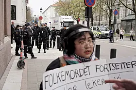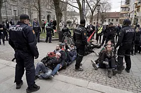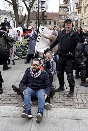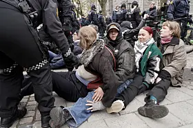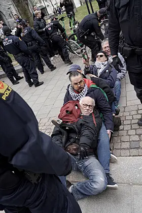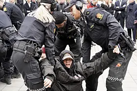 Demonstranter blokkerte her inngangene og etterkom ikke politiets pålegg om å fjerne seg fra inngangspartiene. Politiet valgte med det å fjerne dem fysisk fra stedet, meldte operasjonssentralen i en oppdatering idet klokken nærmet seg 12.00.