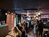 Gjestene har rullet inn siden klokken 13. I første etasjen serveres det som alltid pizza og drikke, mens i etasjen over går samtalene i ny og gammel musikk, i alt fra rock og hip hop, til jazz og samtidsmusikk.