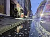 Vann i gatene etter slukkingen på stedet.Foto: Petter Terning