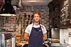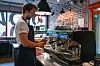 Arbeidsoppgavene hans består blant annet i å lage kaffe, tilberede mat og servere kunder.