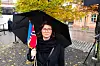 Iryna Sabor stilte med norsk og ukrainsk flagg i regnet på Harald Hårdrådes plass.Foto: Johannes Hellstrand Frøshaug