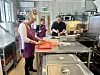 Loftheim og Kvikstad forteller at den hjemmelagde maten er noe mange setter stor pris på på gården. Her er kokk Morten Bryn sammen med de frivillige Astrid Birkeli (t.v.) og Monika Müller.Foto: Vilde Nyseth