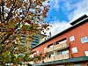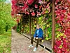 Fra det lille amfiet ved Leirfossen krysser vi Alnaelva, og passerer en rekke av de gamle fabrikkbygningene. Stien langs gjerdet er vakkert beplantet, og lyser illrødt mot oss, og Bernt tar seg en liten pust i benken. Slitsomt å gå nedover mot byen …