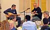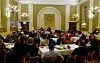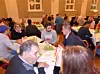 Deltagerne får utdelt hvert sitt ark med to samtaleemner som skal diskuteres. I dag er temaet maten som skal serveres senere og besøket fra Kristelig Gymnasium. Noen har med seg små barn. Disse blir sysselsatt med leker og tegnesaker ved et eget barnebord.