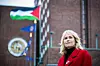 Høyre-ordfører Anne Lindboe foran palestinsk flagg på Rådhuset 29. november 2023. Året etter stemte Høyre mot flagging på FNs dag for solidaritet med det palestinske folket.Foto: Ole Berg-Rusten / NTB