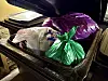 – På sikt planlegger vi å gi alle husstander en egen dunk til matavfall utenfor boligen, sier etatens kommunikasjonsrådgiver. Her en felles avfallsdunk med restavfall, matavfall i grønne poser og lilla poser til plast.Foto: Ingri Valen Egeland