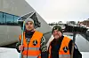 Mille Windfeldt og Per Elvestuen i Clean Sea Solution foran den midlertidige flytebryggen ved Operaen.Foto: Johannes Hellstrand Frøshaug