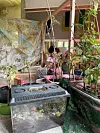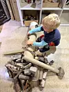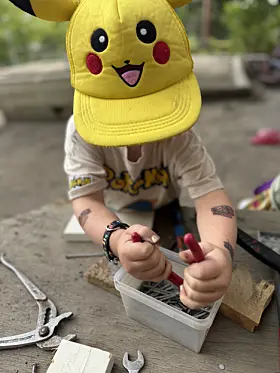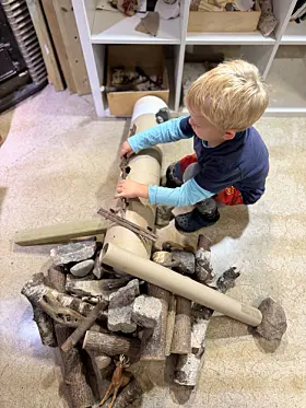 inne og snekkerverksted ute, hvor de kan skru og spikre.