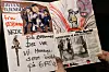 bok med tegninger, avisutklipp og kommentarer. Han blar, peker og forteller om