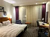 Sånn ser det romslige hotellrommet ut, med dobbeltseng og skrivebord.