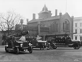Nye Benz-brannbiler med mannskap ved brannvakten i Karl Johans gate (1926).Foto: Anders B. Wilse / Oslo Museum