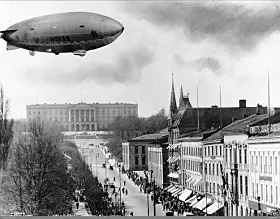 Luftskipet Norge svever over Karl Johan 14. april 1926.Foto: Anders B. Wilse / Oslo Museum