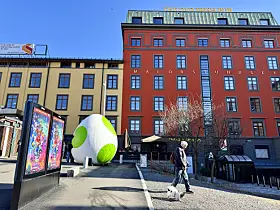 Reklameplakater og gigantegg foran Majorstuhuset.Foto: Ingri Valen Egeland
