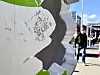 En uvanlig stor påskeinstallasjon ved T-banestasjonen, tenker du kanskje, men den gang ei. Anledningen er en annen. Flere har stoppet opp for å la seg avbilde ved det gigantiske egget.Foto: Ingri Valen Egeland