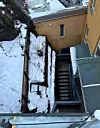 Gangvei til leiligheter til Ribbungata, sett ovenfra. Til venstre i bildet er skråningen der det datt ned en bit av lecablokk-muren.Foto: Oslo politidistrikt