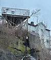 De peker også på en balkong på adressen i Ekebergveien, som er festet i fjellveggen og strekker seg over den bratte skråningen. Denne frykter sameiet også at kan falle sammen med tiden.