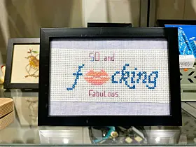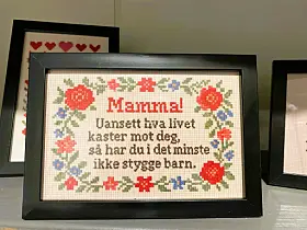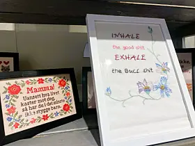 På veggene henger morsomme geriljabroderier. For eksempel «It’s