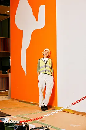 Mari Slaattelid skal male en frise direkte på veggen i det nye regjeringskvartalet.Foto: Niklas Hart